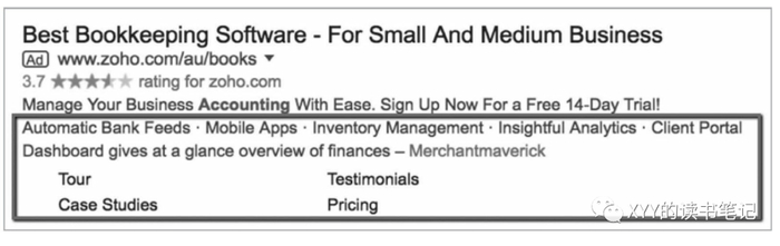 首先是sitelinks,即你的官网的细致目标链接,就像上图广告中一样,如果你的广告在最顶端4个premium广告位显示,Google会显示你的sitelinks。