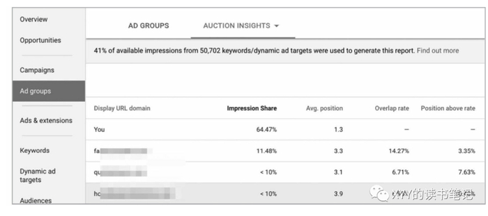 你甚至可以看竞对的市场份额:Adworks有个Auction Insights选项,里面可以看到自己以及竞对的市场份额对比。