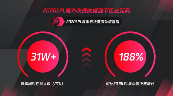 在国内观赛数据得到增长的同时,LPL的国际影响力在2020年也得到了充分释放。去年,LPL海外流直播新增了越南流、韩语流以及法语流,覆盖了更多海外的英雄联盟受众,进一步拓展了LPL的影响边界。与此同时,2020LPL海外收视数据也创下了历史新高——2020LPL夏季赛决赛的海外流直播最高同时在线人数达31万,相比2019LPL夏季赛决赛增幅188%。