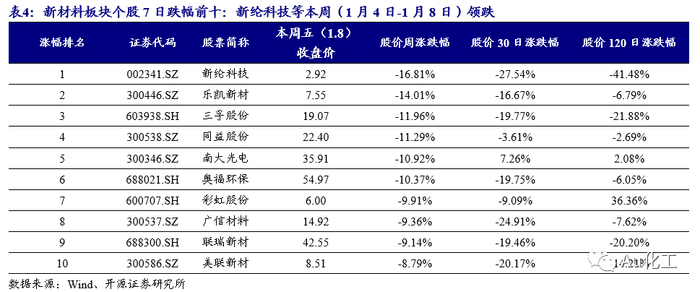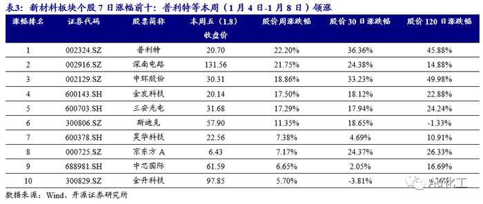 本周新材料板块的100只个股中,有28只周度上涨(占比28%),有71只周度下跌(占比71%)。7日涨幅前五名的个股分别是:普利特、深南电路、中环股份、金发科技、三安光电;7日跌幅前五名的个股分别是:新纶科技、乐凯新材、三孚股份、同益股份、南大光电。