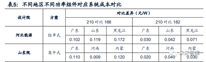 光伏电站实际项目数据显示,210大尺寸组件对应系统成本相比166尺寸低 0.1-0.17元/W,相比182尺寸低3-7分/W。210产品的550W、600W以及660W,都 是为大型地面电站设计的产品,目前进入量产的型号是550W。根据河北能源工程设 计院和山东电力工程咨询院两家单位对于此款型号在不同纬度项目的系统造价差异 对比结果,相比166的450W组件,550W组件系统成本降幅在0.1-0.17元/W之间;与182的540W组件相比,降幅在3-7分/W之间。并且,由于高纬度地区的支架、桩 基础、线缆等用量增加,系统造价差异更加明显。