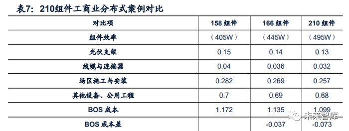 基于210硅片的组件产品,可通过多元化的版型设计,实现多种功率段产品, 推动各个细分应用市场的降本增效。目前行业里发布的210组件,共有约5款尺寸, 组件输出功率在400W到660W之间,分别用于不同的细分市场,涵盖户用市场、工 商业分布式、农光渔光等复合项目以及大型地面电站等多场景。根据对使用210的 400W小组件的户用分布式案例分析,装机容量较158/166组件可分别高12%/10%。对装机容量固定的工商业分布式,495W的210组件通过节省支架、线缆等,可实现 BOS成本相比158/166组件分别降低0.073/0.036元/W。