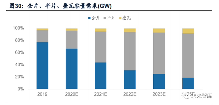 半片以及半片+MBB的良率控制相对成熟,设备资金投入较低,预计将逐渐成 为市场主流高效封装技术。根据光伏行业协会数据,2019年组件封装技术仍以全片 为主,市场占比约77.1%。半片市场份额有望逐渐扩大,预计2021年渗透率超过50%, 成为主流高效组件封装技术。