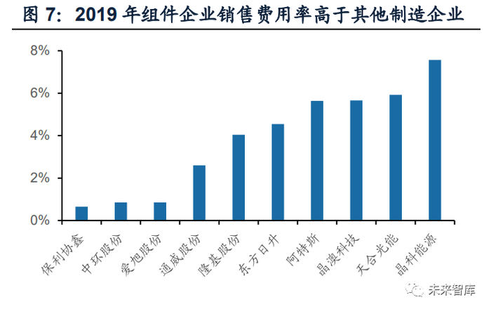 组件是光伏行业唯一具有消费属性的环节,销售费用率在产业链中处于最高水 平。对光伏制造而言,在产业链中的位置越靠下游,消费属性越强,对企业销售能 力的要求越高。不同于B2B模式的上游企业,组件环节需要面对更多大型招标项目 及分散的中小型非商用客户,且客户需求的定制化程度高,更强调售后质保,具有 很强的消费属性,渠道销售的重要性更加明显。2019年晶科能源、晶澳科技、东方 日升、隆基股份组件企业销售费用率分别达到7.6%、5.7%、4.6%、4.0%,明显高 于保利协鑫(0.65%)、中环(0.85%)、通威(2.6%)等硅料、硅片厂商,也体现出组件 环节对销售及渠道的重视程度。