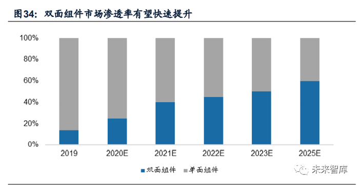 双面组件需求拐点已至,渗透率有望大幅提升。过去双面技术应用普及较慢, 主要受制于应用推广难点制约,例如重量过重带来的外部成本,光伏玻璃供需紧张造成成本过高,背面发电标准未统一,市场项目实绩少等问题。2018年起受到中国 领跑者规划大量双面发电组件需求的带动,制造商对双面组件的特性与产出累积了 更多经验,双面电池需求开始加速提升。根据CPIA,2019年双面组件渗透率14%, 预计2020年双面市占将提高至25%,2023年达到50%,成为主流组件封装技术。