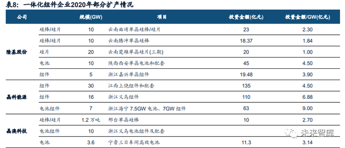 (3) 隆基股份:以硅片产能为主,2015年收购乐叶实现组件领域拓展。2019年底公 司硅片/电池片/组件产能分别为45GW/15GW/16GW,预计2020年底产能分别 达到75GW/25GW/40GW,相比2019年分别增加30GW/5GW/24GW。