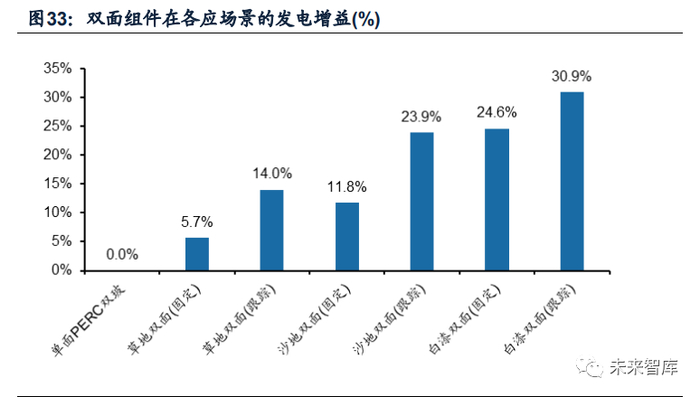 反光条件越好,双面组件发电增益越高。在反光条件好的雪地、沙漠等场景发 电增量效果更佳,根据双面组件在户外实证基地得出的发电增益数据来看,对应双 面跟踪组件的背面为草地、沙地、白漆地面时,其背面的发电增益分别为14%、23.9%、 30.9%,近年光资源丰富、地势平坦的美洲地区以及沙漠较多的中东地区对双面组 件接受程度大幅提升。