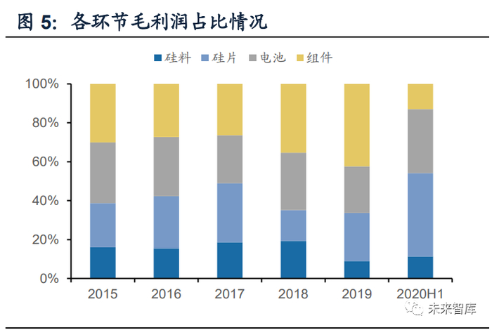 2020年二季度受到疫情影响,组件价格出现大幅下滑,毛利占比收缩;三季度 受到硅料产能事故导致的硅料大幅涨价影响,光伏产业链价格出现成本驱动型的“自 上而下”涨价,由于组件环节向下游电站继续传到涨价能力有限,单一组件环节的盈 利水平被进一步压缩。