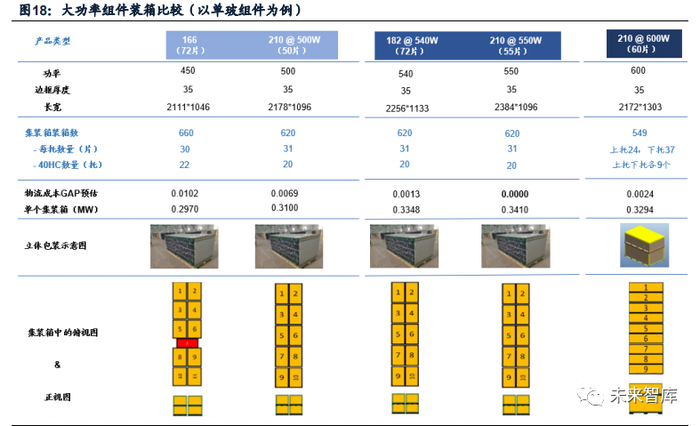 运输方面:常用40HC(高柜)集装箱的内尺寸为12*2.35*2.69米,门高2.58米。根据不同组件的尺寸数据可以计算得出,210硅片550W(55片)/500W(50片)组 件的运输成本可以做到比166(72片)450W组件运输成本分别低0.0102元/0.0033 元/W,182(72片)的540W组件运输成本比166(72片)450W组件低0.0089元/W。当210硅片组件做到600W(60片)时,通过将组件在集装箱中的摆放方式由横放调 整为竖放,运输成本仅比210尺寸550W组件高0.0024元/W,仍低于166尺寸450W 组件0.0078元/W。