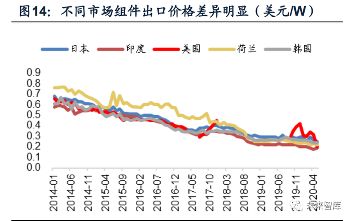 海外市场组件售价差异明显,龙头享受品牌及渠道溢价。全球前5大光伏市场分 别为中国、欧洲、美国、印度、日本,2019年全球新增装机占比分别为31%、20%、 9%、8%、7%。印度市场对光伏产品价格敏感,更倾向于选择价格更优惠的产品。2019年美国光伏新增装机13.3GW,同比+23%,装机大幅增长带动美国市场组件需 求旺盛,产品价格也显著高于其他市场。晶科、晶澳作为老牌组件龙头,2018-2019 年组件出货量始终位于全球前两名,组件出口价格显著高于比亚迪、正泰电器、东 方日升、韩华、阿特斯等企业。伴随着出货量增长及品牌知名度提升,隆基股份组件也获得明显溢价,2019年组件出口单价较韩华、阿特斯、日升、正泰、比亚迪分 别高出3.7%、3.7%、4.4%、12.2%、19.6%。