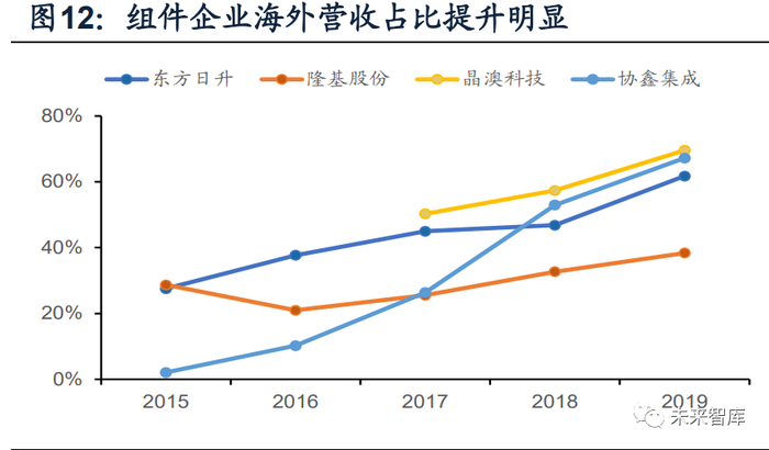 此外,海外成熟市场组件订单一般提前2-3个季度下单,锁定组件的美元价格, 而国内一般仅提前1个月下单,在产业链整体降价迈向平价上网的趋势下,海外订单 具有明显价格优势。2019年,晶澳科技、隆基股份、东方日升、协鑫集成海外营收 占比分别达到69.57%、38.38%、61.74%、67.20%,相比2017年分别提升19.30pct、 12.83pct、16.75pct、40.83pct。