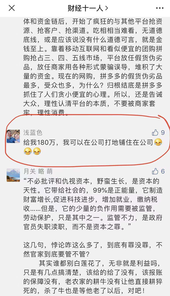 从劳方看,抱怨更多的不是加班,而是加班不给加班费。在既给高工资又给加班费的公司,996大小周看来是愿打愿挨的事情。财经十一人本周二报道了拼多多员工猝死和互联网公司争抢卖菜业务,文章下面有条评论颇有代表性——给我180万,我可以在公司打地铺住在公司。