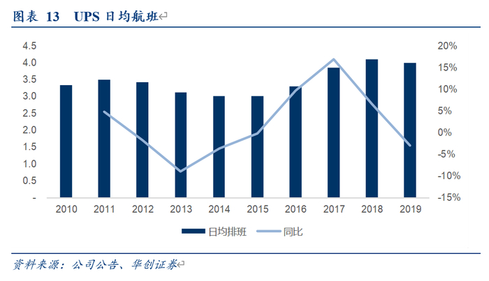 时刻分布将有效推动飞机利用率提升。2019年顺丰航空基本集中在夜间飞行,导致货机利用率处于低位,平均日排班1.7班,低于邮政航空2.1班以及中货航的2.4班,更是远低于UPS日均4.3班排班。作为我国最大货机机队公司以及最大航空货主,虽然顺丰具备先发优势,并获取了最多的航空时刻总量,但在结构上看,缺乏相匹配的非夜间时刻一定程度也制约了公司飞机利用率。