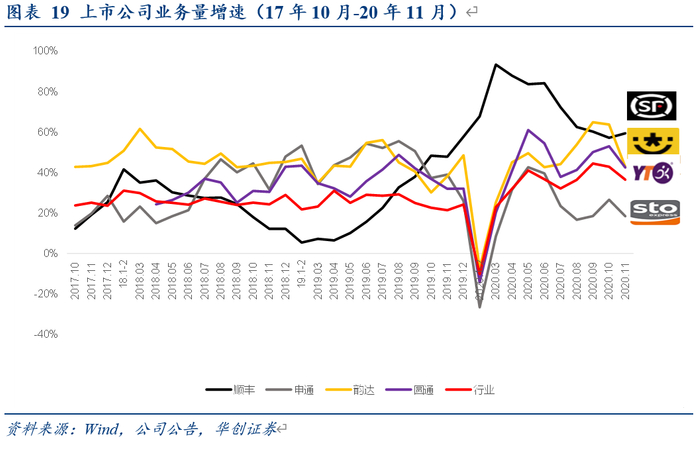 2020年1-11月累计业务量增速:顺丰(71.1%)>韵达(42.0%)>圆通(37.9%)>行业(30.5%)>申通(18.9%)。