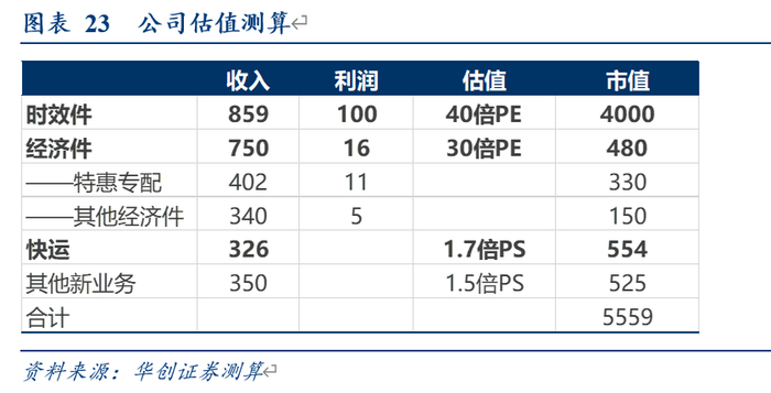 我们认为时效业务价值4000亿市值(预期2022年利润100亿左右,给予40倍PE);