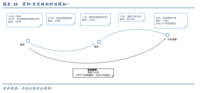 提升时效方面,我们此前以贵阳-北京寄递物品路由为例,做进一步展开说明。若公司鄂州枢纽机场启用后,贵阳与北京(尤其大兴机场)各自可以连接鄂州,则公司揽收节点会发生变化,我们倒推预计可将次晨达(12点)产品揽收节点从13点延后至16点30分,揽收节点的延后意味着产品时效提升,同时也意味着辐射范围的扩大。