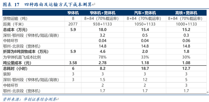 窄体机(深圳-鄂州)+宽体机(鄂州+北京):吨公里成本2.78元,综合耗时8.2小时;