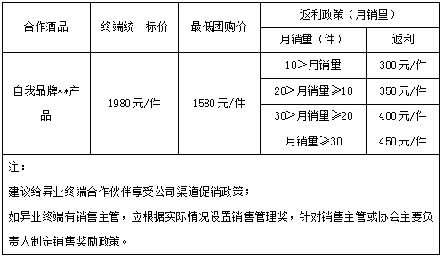 建议采取坎级式返利的政策执行。制定异业合作终端“坎级返利政策”,要求异业合作伙伴按照公司规定的统一团购价进行销售,公司以“返现金”的形式进行支付异业终端返利。以“某品牌高端产品”为例(具体设定参考区域内实际情况)