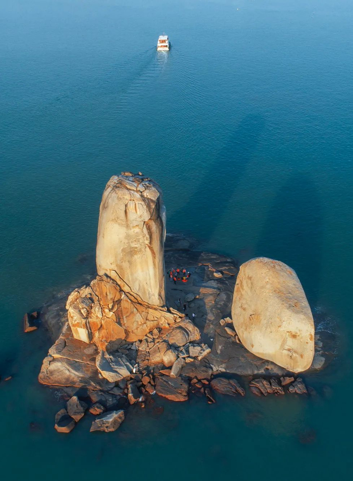 这里有中国最大的花岗岩海蚀柱,两块巨石屹立于洋面,犹如凝固的风帆,被称为“半洋石帆”;这里有栩栩如生的人形巨石,头枕沙滩,足伸大海,被叫做“海坛天神”。