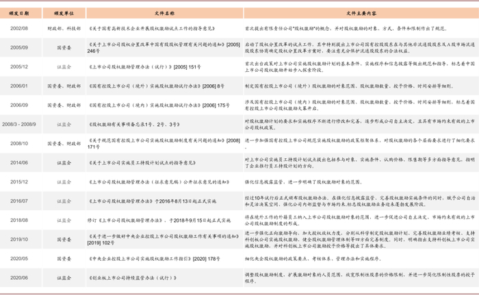 自2006年国资委印发《国有控股上市公司(境外)实施股权激励试行办法》和《国有控股上市公司(境内) 实施股权激励试行办法》以来,先后又出台了《关于规范国有控股上市公司实施股权激励制度有关问题的通知》、《国有科技型企业股权和分红激励暂行办法》,以及《关于进一步做好中央企业控股上市公司股权激励工作有关事项的通知》等多个政策文件,构建了国有上市公司实施股权激励的制度框架。