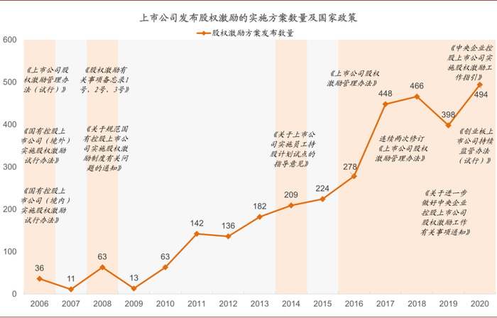 图表:上市公司在国家政策的推动下,积极探索股权激励机制,其发布实施方案的数量整体呈现上升趋势