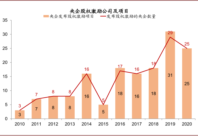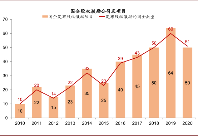 根据万得统计显示,2010年至2020年底共有285家A股上市国企发布379个股权激励计划,尤其是在2016年7月证监会发布《上市公司股权激励管理办法》后,实施股权激励的国企数量显著上升。2019年,共有60家国企发布64个股权激励公告。其中央企29家共发布31个股权激励计划,比2018年增加60%。2020年,50家国企发布51个股权激励计划,其中央企为25家共25个股权激励计划。我们认为随着国有企业改革不断深化,国企尤其是央企控股上市公司实施股权激励的数量有望提升。