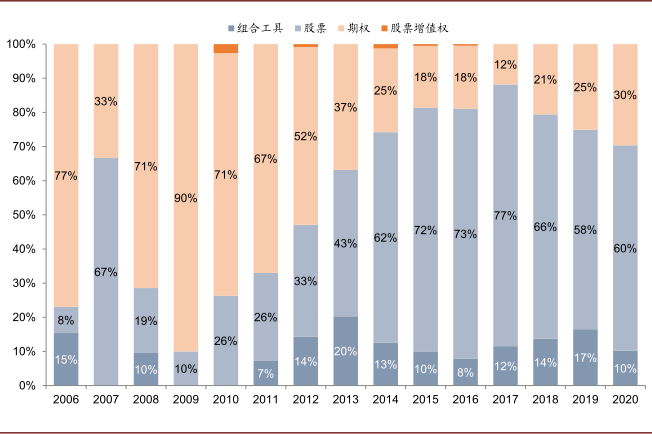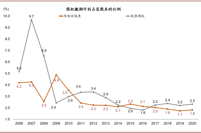 图表:2006年至2020年年底,限制性股票是主要的股权激励方式