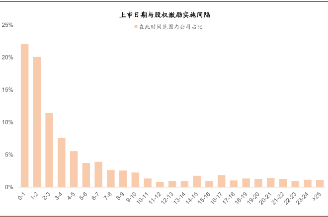 3) 次新股较易开展股权激励,上市3年内是实施股权激励的高峰期。根据万得数据,54%的公司在上市3年内发布了股权激励项目,可能意味着公司上市的初期对公司未来的发展具有较强的信心,同时对激发员工积极性有较强的动力。