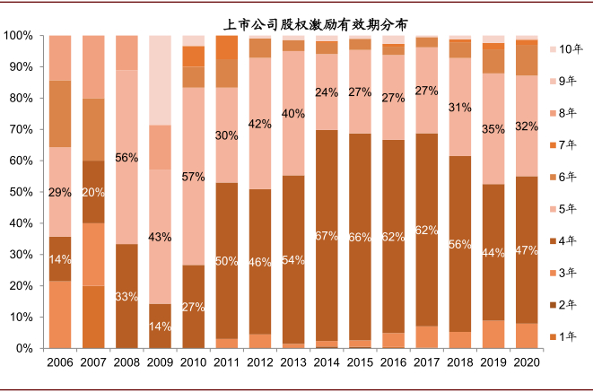 7) 股权激励坚持中长期考核机制。自2011年至今,上市公司股权激励方案有效期为4年至5年的比重最大,占方案总数的80%-95%。4至5年方案有效期对应3至4年的业绩考核周期,说明上市公司看重“中长期”激励效果。激励周期过短易造成激励对象引起急功近利的短期行为,不利于公司的可持续发展;而激励周期过长,比如达到10年以上,也容易因为激励对象个人对未来职业发展不确定性以及公司经营战略不确定性而导致与激励目标脱节。