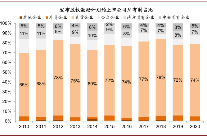 图表:2010年至2020年年底,民营企业实施股权激励的公司数量占所有股权激励公司的74%