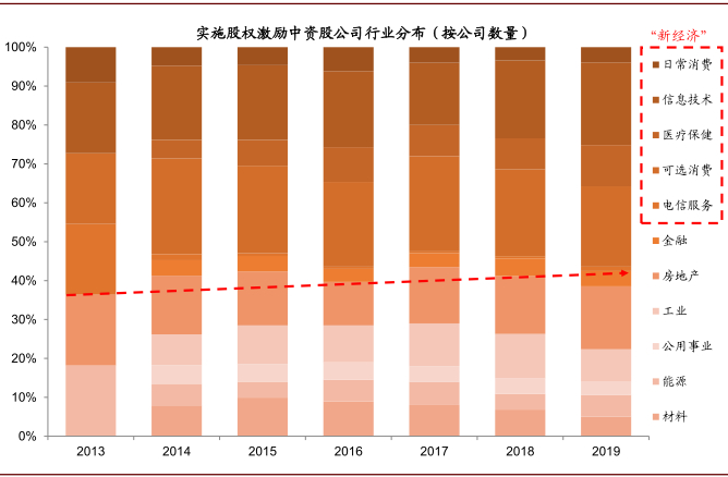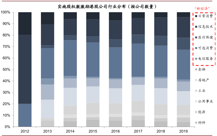 1) 从行业分布来看,可选消费、信息技术、房地产板块的港股上市公司实行股权激励相对较多。实施股权激励的香港中资股公司也多集中在上述三个板块。可选消费、信息技术、医疗保健、可选消费以及电信服务等“新经济”板块占比约为60%。