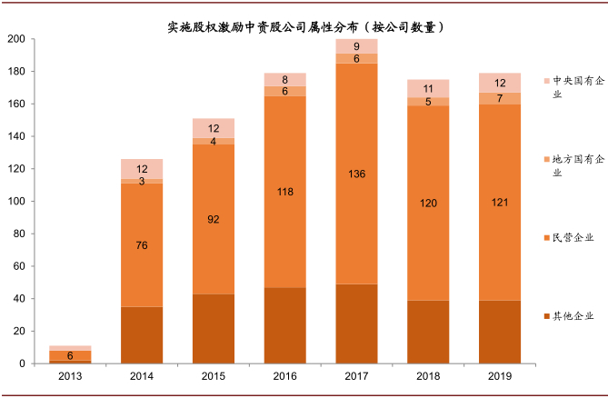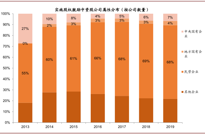 4) 民营公司更愿意做股权激励。万得数据显示,自2010年以来,民营企业实施股权激励的公司数量占所有股权激励公司的74%,是实施股权激励的主力军。但未来国企施行股权激励的数量也有望明显提升。