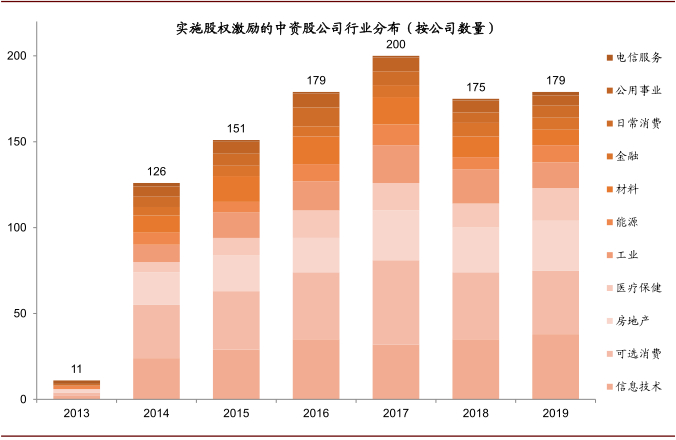 2) 从公司属性来看,民营背景企业占实施股权激励中资股的68%,央企和国企各占7%和4%。从2013年起,央企和国企实施股权激励的数量变化不大,股权激励整体数量的增加主要来自民营企业。