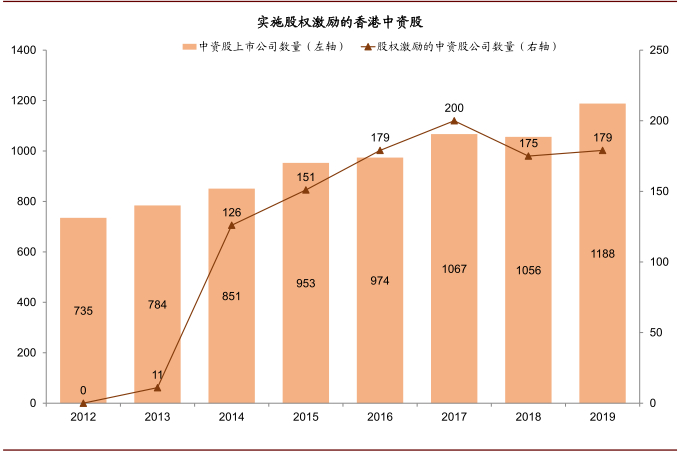 根据Factset的不完全统计,港股上市公司股权激励实施数量在2012至2017年之间呈现上升趋势。根据2019年年报统计,共有357家在当年实行股权激励,其中中资股179家,约占中资股总数的15%。