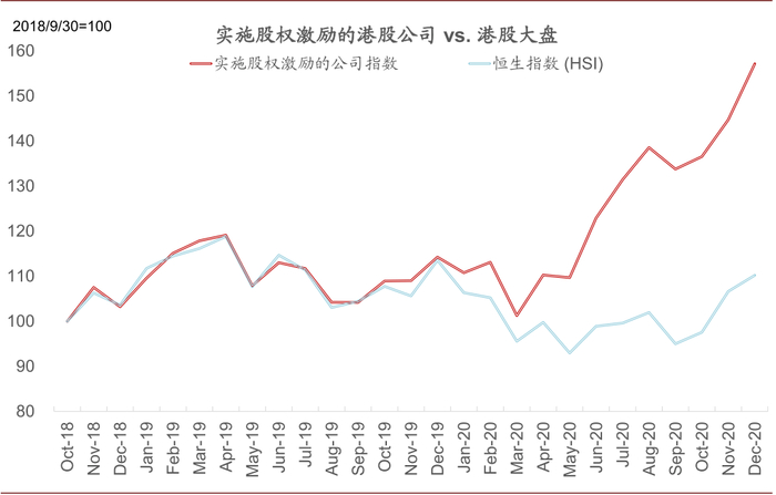 图表:港股实施股权激励的港股上市公司整体跑赢恒生指数