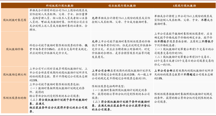 图表:科创板、创业板及A股主板现行的股权激励政策梳理