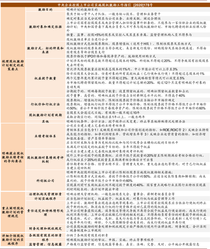 2020年5月,国资委正式对外发布《中央企业控股上市公司实施股权激励工作指引》,内容涉及央企控股公司股权激励各方面施行细节,我们认为对推进完善央企控股上市公司建立健全长效激励约束机制具有重大意义。主要内容细节包括:
