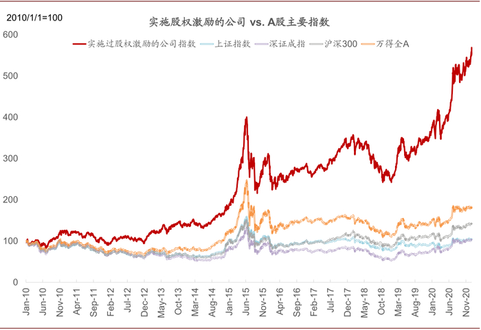 图表:实施股权激励的A股上市公司整体大幅跑赢大盘主要指数