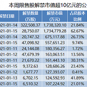 除江苏银行外,本周盈趣科技(002925.SZ)也有超过170亿市值的限售股解禁。此次为公司上市三年的首发限售股解禁。根据计划,盈趣科技1月15日将有2.88亿股首发限售股解禁,占总股本的62.67%,解禁市值173.48亿元。盈趣科技发行价22.50元/股,最新收盘价60.34元/股较发行价有1.68倍的上涨。不过截至记者发稿时,公司仍未披露解禁公告,具体解禁日期以公告为准。