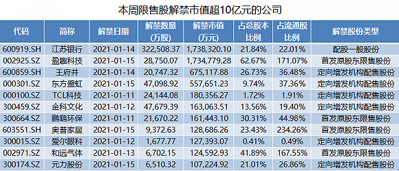 此外,本周限售股解禁数量超过1亿股的上市公司合计有7家,分别为江苏银行、金科文化(300459.SZ)、东方盛虹、盈趣科技、TCL科技、鹏鹞环保(300664.SZ)、王府井(600859.SH)。
