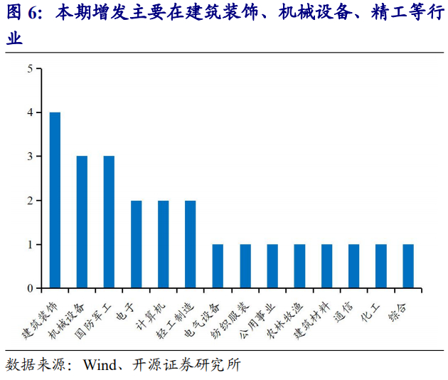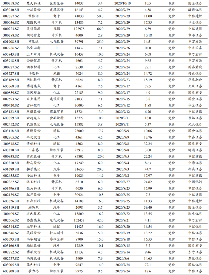 本期增发预案公告24例,募集金额273亿,数量有所增加,金额小幅上升。(1)发行方式看,定价发行9例,竞价发行15例。(2)认购方式看,现金认购21例,资产认购3例。(3)募集资金273亿,全部为现金认购。募资用途看,主要用途分别是项目融资(14例)、融资收购其他资产(4例)、配套融资(3例)、补充流动资金(2例)、引入战略投资者(1例)。(4)行业看,本期增发预案集中在建筑装饰、机械设备、国防军工等行业,2019年以来增发主要集中于机械设备、化工、电子等领域。
