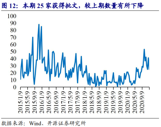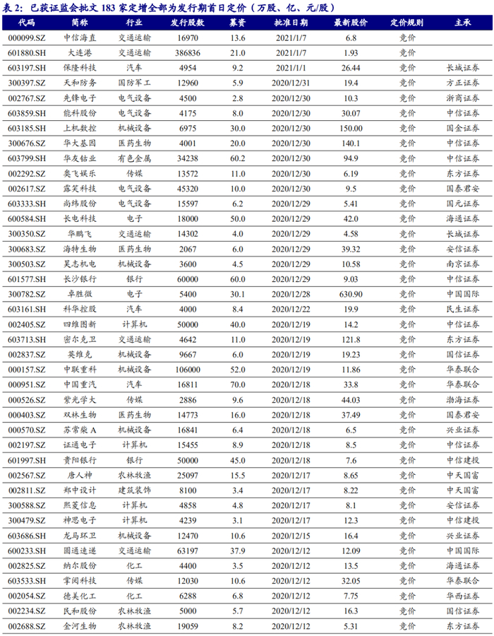 本期25家公司获得发审委或并购重组委员会通过、25家公司拿到批文,过会速度和批文速度均有所上升。截止到2021年1月8日,已获得证监会批准的竞价增发预案数为183家。