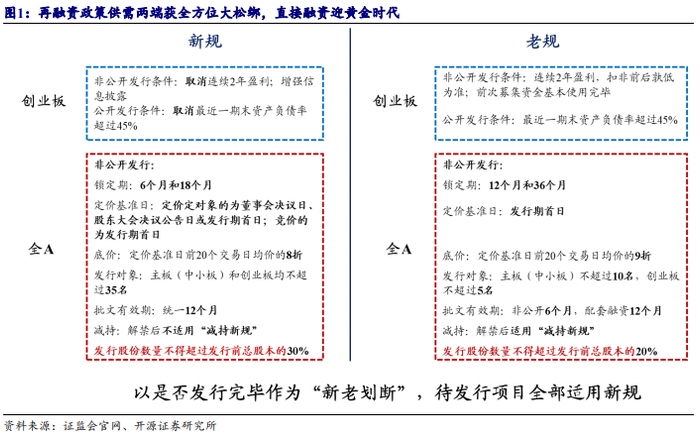 再融资新政正式发布:2020年2月14日晚,为深化金融供给侧结构性改革,完善再融资市场化约束机制,增强资本市场服务实体经济的能力,助力上市公司抗击疫情、恢复生产,证监会发布了《关于修改的决定》《关于修改的决定》《关于修改的决定》(以下统称为再融资新政),自发布之日起施行。同时对《发行监管问答——关于引导规范上市公司融资行为的监管要求》进行修订,适度放宽非公开发行股票融资规模限制,并同步公布施行。再融资新政从供需两端对再融资进行了全方位的大松绑。供给端看,取消了创业板非公开发行对于连续2年盈利和前次募集资金基本使用完毕的要求,且使用进度和效果与披露情况基本一致由发行条件调整为信息披露要求;创业板公开增发的条件也取消了最近一期末资产负债率超过45%的要求;发行股份数量的上限也由发行前总股本的20%提升至30%。需求端而言,新政从提升折价率上限、缩短锁定期、放松减持限制、降低参与门槛四大维度全面提升了定增市场对于资金方的吸引力。定价定增定价基准日由发行期首日改回为董事会决议日、股东大会决议日或发行期首日,并且定价和竞价的底价由原有的定价基准日前20个交易日均价的9折提升到8折,折价率上限提升。锁定期则是由原来的12个月和36个月大幅缩短到6个月和18个月。定增股份限售期解禁之后也由原来的受减持新规限制改为不受限制。同时将参与认购对象由原来创业板不超过5名、主板(中小板)不超过10名统一改为不超过35名,单份认购金额减小,参与门槛降低。此外,非公开发行批文的有效期统一延长为12个月。