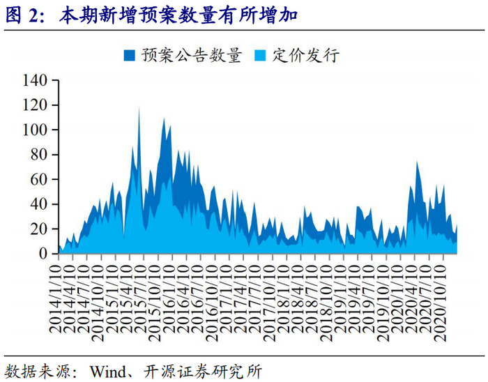 (3)回顾2020年,A股新增公告成功发行案例342例,共募集资金8019亿元,发行案例数量及金额均实现同比大幅增长。其中,已按新规发行的竞价定增项目189例,而在新规后供给端快速回暖、需求端相对不足的背景下,平均发行折价率达到16.3%的历史峰值。收益率方面,截至本期末2020年按新规发行的竞价定增项目平均收益率为22.7%,收益率前五分别为东方盛虹(164.3%)、宁德时代(151.2%)、新宙邦(140.8%)、长安汽车(119.0%)、寒锐钴业(111.3%),多为新能源汽车产业链公司。近期来看,发行端回暖持续加速,本期发行实施项目数量再创新高,已达到2018年以来的最高水平。目前供给端储备项目依旧充沛,现存竞价定增融资预案516例,预计总融资规模达到7299.8亿元(部分配套融资尚未披露融资规模),按现有发行节奏可满足未来至少10个月的发行。因此,预计2021定增市场依旧会是供大于求的格局,高折价率的投资机会将继续。