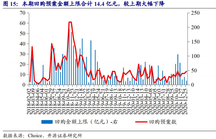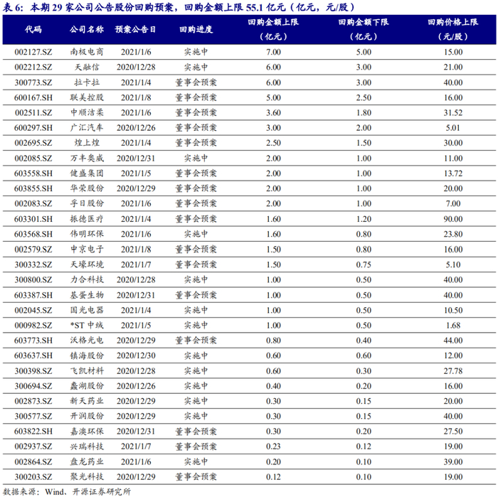 本期共 29 家公司推出股份回购预案,回购预案上限金额合计 55.1 亿元,数量及金额 均大幅增加。回购上限金额前十由高到低分别为南极电商、天融信、拉卡拉、联美 控股、中顺洁柔、广汇汽车、煌上煌、万丰奥威、健盛集团、华荣股份。