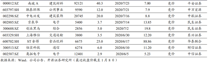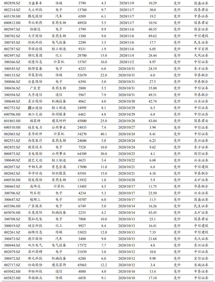 股权激励:本期有34家公司推出了限制性股票或股票期权激励。其中启明信息、傲农生物、科沃斯、精研科技激励力度大的同时业绩要求高,建议重点关注。增持:本期山石网科、万兴科技、现代投资、神开股份获重要股东增持5%以上。回购:本期共29家公司推出股份回购预案,回购预案上限金额合计55.1亿元,回购上限金额前十由高到低分别为南极电商、天融信、拉卡拉、联美控股、中顺洁柔、广汇汽车、煌上煌、万丰奥威、健盛集团、华荣股份。