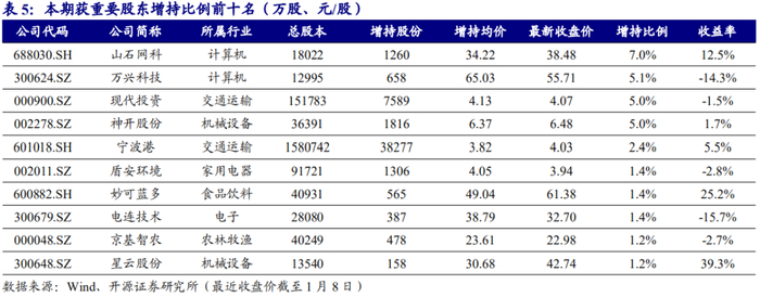 本期山石网科、万兴科技、现代投资、神开股份获重要股东增持 5%以上,增持比例 前十的公司分别为山石网科、万兴科技、现代投资、神开股份、宁波港、盾安环境、 妙可蓝多、电连技术、京基智农、星云股份。其中,山石网科获鸿腾智能、奇虎科 技(两者均为三六零安全科技的全资子公司)以自有资金通过集合竞价、大宗交易 的方式累计增持 1260 万股(占总股本 7%),增持均价为 34.2 元/股。万兴科技获施 罗德投资基金通过集中交易的方式累计增持 658 万股(占总股本 5.1%),增持均价为 55.71 元/股。现代投资获湖南轨道交通控股集团通过集中交易的方式增持 7589 万股 (占总股本 5%),增持均价为 4.07 元/股。神开股份获李清江通过公开司法拍卖竞买 的方式增持 1816 万股(占总股本 5%),增持均价为 6.73 元/股。