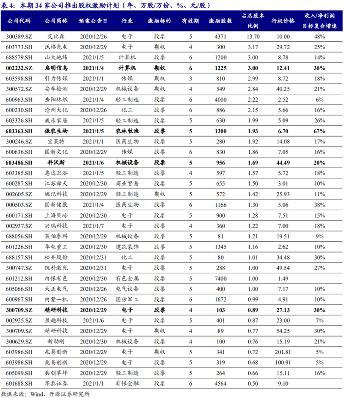 4.1、本期34家公司推出股权激励预案,启明信息、傲农生物、科沃斯、精研科技激励力度大的同时业绩要求高