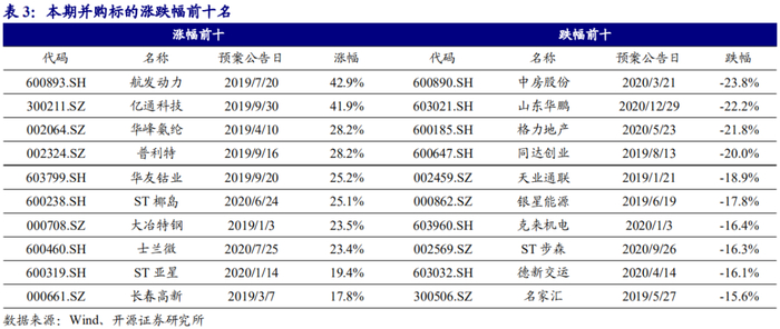 (2)本期并购627例,并购涉及金额1404亿,数量及金额均有所下降。从并购标的行业分布看,本期计算机、传媒、电子等领域并购展现较高的活跃度。本期并购重组市场情绪有所回落:(1)整体看,2019年以来涉及发行股份购买资产的265家A股公司本期股价平均下跌2.8%,同期上证指数上涨5.1%,沪深300上涨9.0%,创业板上涨10.9%。(2)本期涨幅最佳为航发动力,涨幅达到了42.9%,主要系国防军工板块带动。