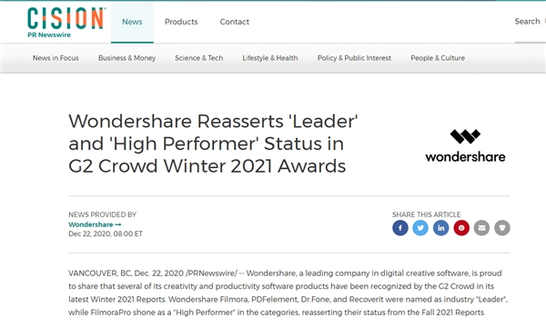 在刚过去不久的2020年,全球领先的业务解决方案评估平台G2 Crowd发布了冬季报告,创意软件A股上市公司万兴科技(300624.SZ)旗下5款产品齐齐获得冬季报告大奖。